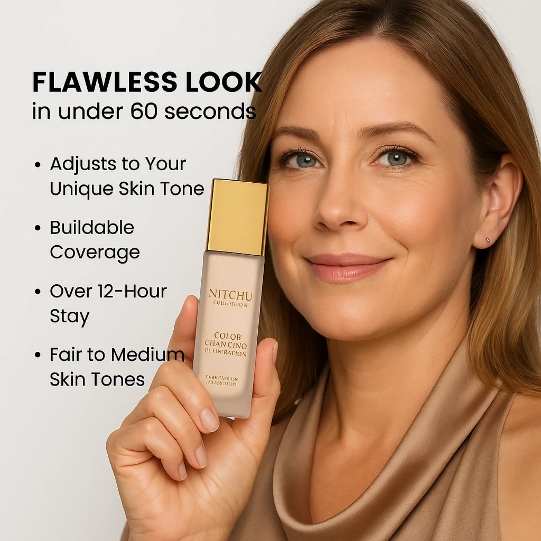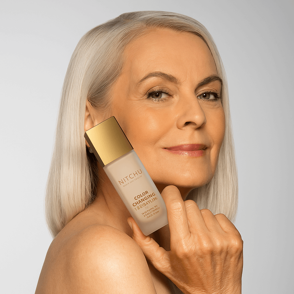 Don’t think of the Nitchu Color Changing Foundation as a ‘novelty’. It’s not. This is a foundation developed from the ground-up for women from 30 to over 50. It offers the light to medium coverage you need to blur pores, erase blemishes, even out discoloration, and reduce redness.