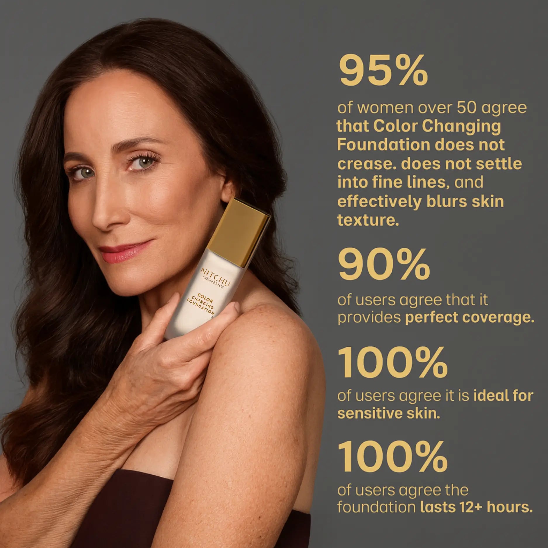 Tester results show this foundation lasts on mature skin for up to 12 hours. No re-application needed.